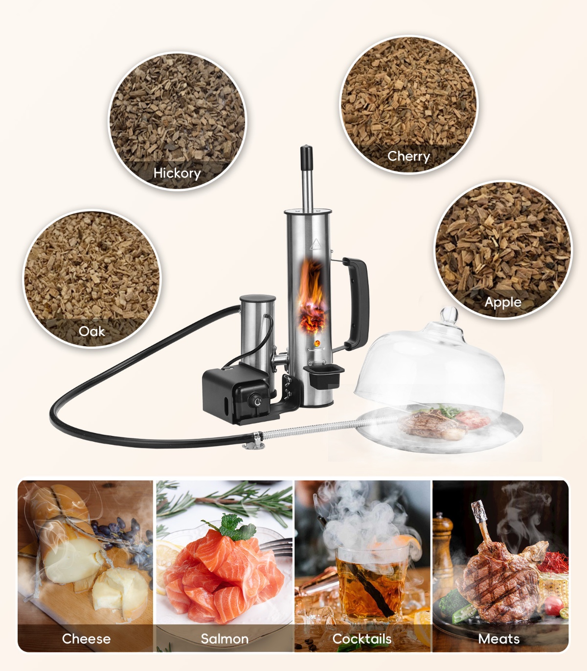 Create mouth watering flavour by adding a controlable fresh wood fired smoke when cold or hot smoking that quality cut on your food.